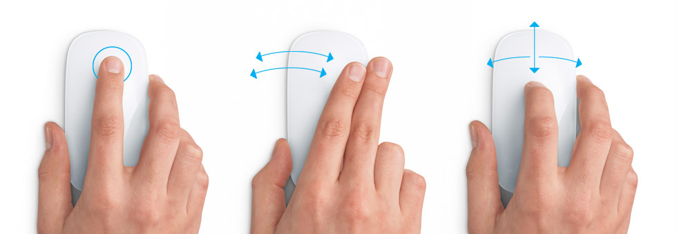 El mouse en cuestion es inalambrico, via bluetooth, con alcance de hasta 10 metros, todavia tiene forma de mouse, pero en vez de contar con botones cuenta con una superficie unica que cubre todo el mouse y que es tactil….perdon….multitactil. Que quiere decir esto? Pues que con simples movimientos de los dedos sobre la pantalla podremos realizar las mismas acciones que se realizaban antes usando 2 boton + la ruedita, y algunas acciones mas que seguramente iran surgiendo a medida que llegue a manos de la gente.